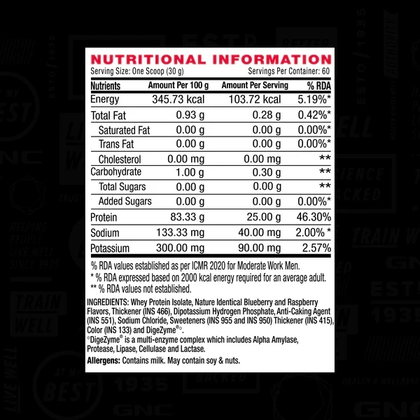 Drive your athletic performance to the highest level with GNC AMP Pure Isolate whey protein. It is prepared using a 20-STEP, quality-driven process to produce the purest, ultra-clean Isolate. GNC’s whey isolate is formulated with 6gms BCAAs to help build more lean muscle mass and prevent muscle cramps & fatigue. It also contains 1.7gm of Creatine building blocks and 19.6gms of muscle-supporting amino acids to boost your athletic capacity and keep the exercise momentum going. GNC's whey isolate protein is easily absorbable in your body for enhanced metabolism and muscle repair. Levelling with its nutritional performance, this whey protein also has an amazing flavour to keep your taste buds happy. In addition, it has zero added sugar and low carbs for adapting to your lifestyle preferences. GNC's isolate protein is World Anti-Doping Agency (WADA) approved and Informed Choice certified.