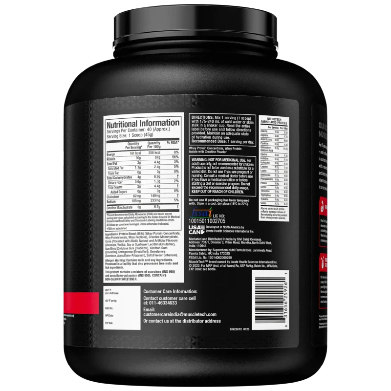 Protein Blend (89%) (Whey Protein Concentrate, Whey Protein Isolate, Whey Peptides), Creatine Monohydrate, Natural and Artificial Flavours (Cookies and Cream, Chocolate), Cookies, Calcium Carbonate (Stabilizer), Soy or Sunflower Lecithin (Emulsifier), Gum Blend (Cellulose Gum [Stabilizer], Xanthan Gum [Emulsifier]. Carrageenan [Emulsifier]), Sweeteners (Sucralose, Acesulfame -Potassium), Salt (Flavour Enhancer).
