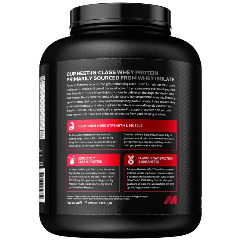 It’s clean and simple. Each scoop serves up 24g of ultra-premium whey protein. Using a cold microfiltration process, Nitro-Tech™ 100% Whey Gold guarantees high quality. After all, what’s inside counts. Try it and you’ll see the difference.