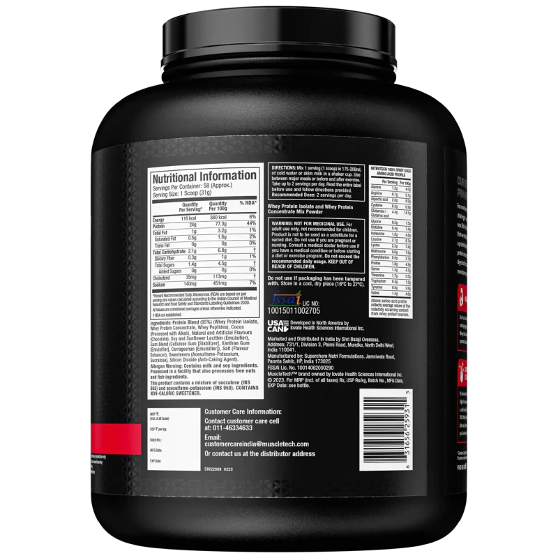 Protein Blend (95%) (Whey Protein Isolate, Whey Protein Concentrate, Whey Peptides), Cocoa (Processed with Alkali), Soy and Sunflower Lecithin (Emulsifier), Natural and Artificial Flavours (Chocolate), Gum Blend (Cellulose Gum [Stabilizer], Xanthan Gum [Emulsifier], Carrageenan [Emulsifier]), Salt (Flavour Enhancer), Silicon Dioxide (Anticaking Agent), Sweetener (Acesulfame-Potassium, Sucralose).
