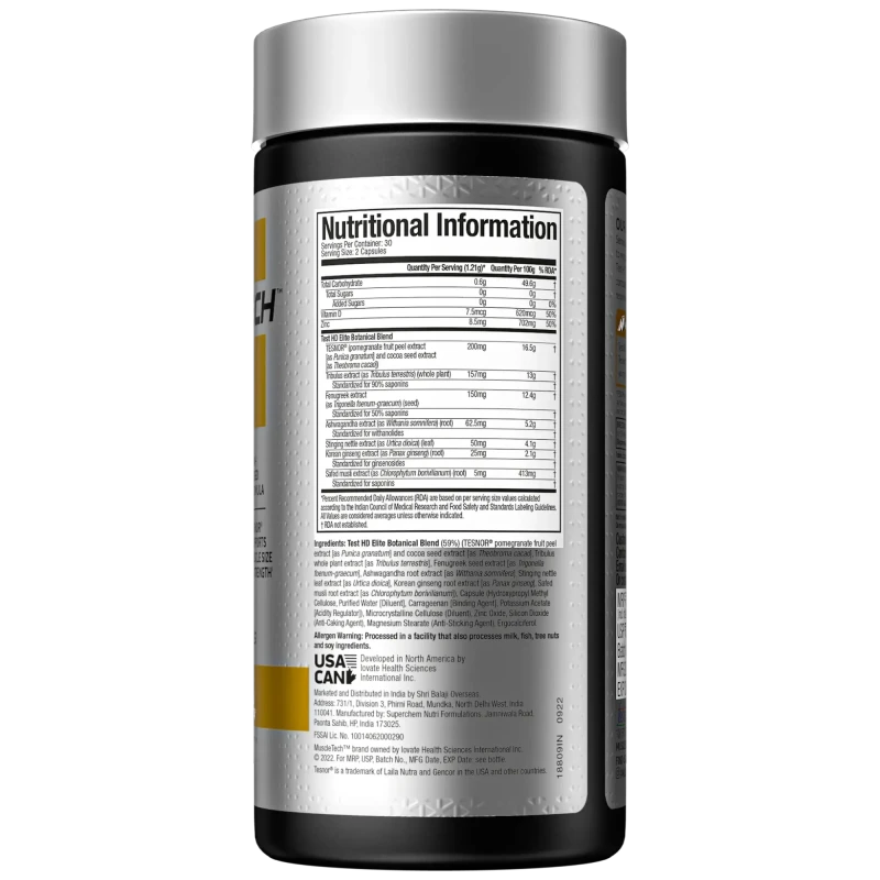 Test HD Elite Botanical Blend (59%) (TESNOR® pomegranate fruit peel extract [as Punica granatum] and cocoa seed extract [as Theobroma cacao], Tribulus whole plant extract [as Tribulus terrestris], Fenugreek seed extract [as Trigonella foenum-graecum], Ashwagandha root extract [as Withania somnifera), Stinging nettle leaf extract [as Urtica dioica], Asian ginseng root extract [as Panax ginseng], Safed musli root extract [as Chlorophytum borivilianum]), Capsule (Hydroxypropyl Methyl Cellulose, Purified Water [Diluent], Carrageenan [Gelling Agent], Potassium Acetate [Acidity Regulator]), Microcrystalline Cellulose (Diluent), Zinc Oxide, Silicon Dioxide (Anti-Caking Agent), Magnesium Stearate (Anti-Sticking Agent), Ergocalciferol.