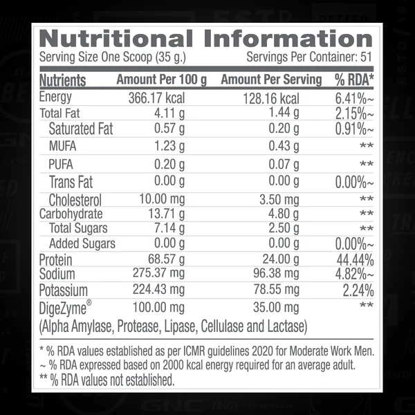 GNC Pro Performance 100% Whey Protein - 4 lbs, kg (Chocolate Supreme). GNC Pro Performance 100% Whey Protein delivers an ultra-high quality macronutrient protein formula with high amounts of naturally occurring amino acids the body needs every day. 100% Whey comprising of Whey concentrate and Whey Isolate.24 grams of high-quality protein with all 9 essential amino acids .5.5g of BCAA & Zero Added Sugar.Gluten Free, tastes great and mixes easily with a simple stir, shake or blend
